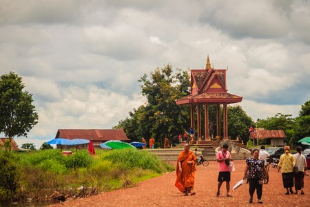 buddhist monk street scene walking outside Wat Svay Andet Pagoda UNESCO site in Kandal Province Cambodia