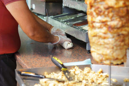 Preparation of Turkish shawarma. the cook's hands in rubber gloves apply a delicious chopped fried chicken meat with a spatula to put it into cakes with shawarma. street food, fast real life, lifestyle.