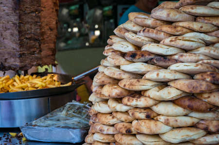 Turkish bread, lavash, pide in pile with potato chips and kebab on the background