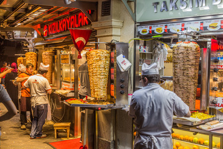 ISTANBUL, TURKEY - JULY 22, 2019: Kebab shops at Taksim square in Istanbul, Turkey