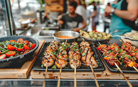 Hot grilled food at the festival of street fast food, sausages, hot dog, fried meat