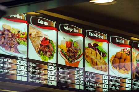 Salzburg, Austria - October 21, 2017: Signboard menu of a traditional kebab restaurant with prices and photos of dishes