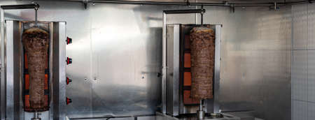 Doner kebab - dish in Turkish cuisine. Roasted meat for shawarma in the street cafe or restaurant