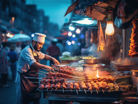 A chef grilling chicken skewers at a busy night market, with smoke and flames adding to the lively atmosphere