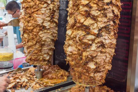 Traditional Turkish food Doner Kebab. Chicken meat grilled on the street