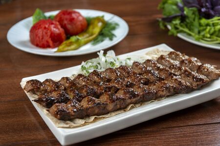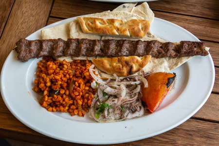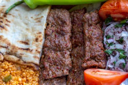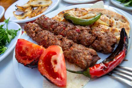 Adana Kebab, traditional Turkish cuisine with kebab meat, vegetables on the plate in Adana, Turkey.