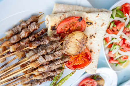 Traditional turkish shish kebab served on white plate with vegetables and lavash