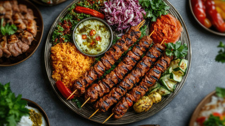 Aerial view of a sumptuous kebab feast featuring various types of kebabs and fresh sides, all elegantly presented on a round plate with a soft-focus background.
