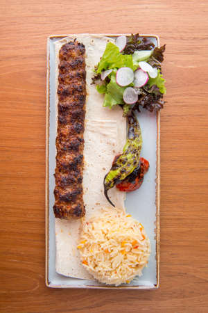 Turkish lula lamb or beef kebab with rice and vegetables isolated on rustic wooden table