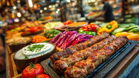 Delicious grilled kebabs with charred meat skewers, fresh vegetables and yogurt sauce on restaurant buffet table. Traditional Middle Eastern barbecue cuisine with colorful peppers and tomatoes.