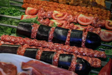 Skewers of fresh ready made Turkish kebabs with ground meat, eggplant and tomatoes, displayed for purchase at a restaurant in Istanbul, Turkey