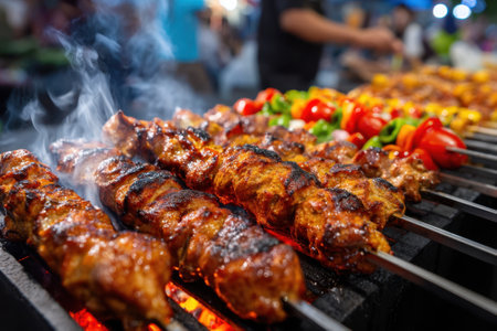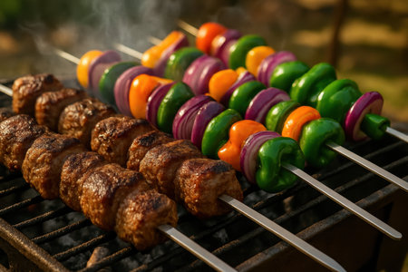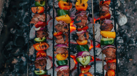 Juicy lamb kebabs and vibrant vegetable skewers with bell peppers and red onions grilling over hot coals, creating a smoky aroma. perfect for outdoor cooking, summer parties, and healthy meals.