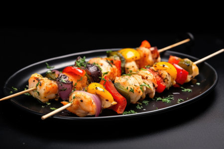 seafood kebabs on skewers on an empty black plate, created with generative ai