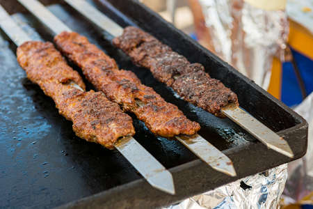 chicken meats and adana kebab cooking on the barbecue, turkish cuisine