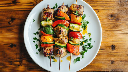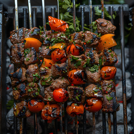 Enjoy a vibrant display of grilled skewers featuring juicy meat and fresh vegetables. Perfect for summer gatherings and outdoor cooking adventures.