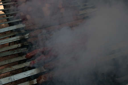 Smoking Shish kebab skewers on grill