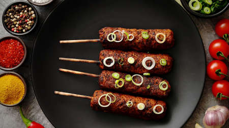 Tasty Barbecued turkey kebab decorated with fresh onion and chive black plate, top view. Dark stone background.