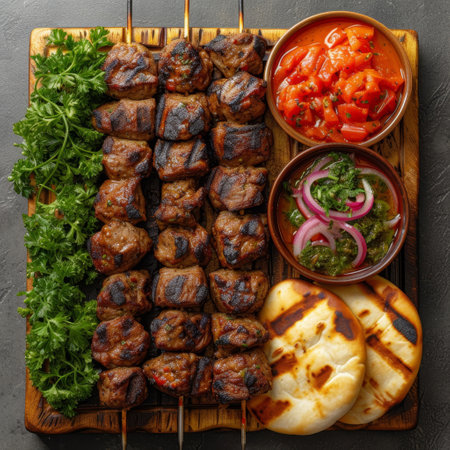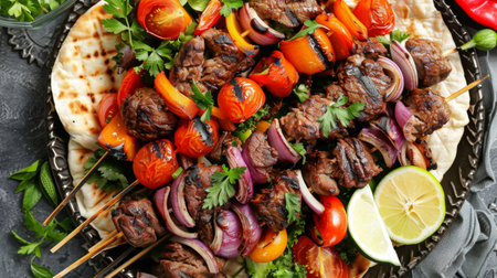 A vibrant platter featuring grilled skewers, fresh vegetables, and flatbreads, ideal for sharing at gatherings or enjoying a hearty meal. Perfect for food lovers!