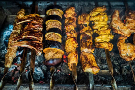Food like meat and vegetables are grilled on skewers