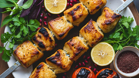 Succulent grilled chicken kebab skewers arranged on a white platter, garnished with fresh herbs, lemon slices, and pomegranate seeds. The charred meat looks juicy and flavorful, representing a classic Mediterranean or Middle Eastern dish.