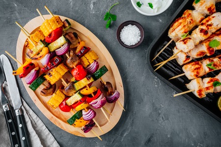 Grilled vegetable and chicken skewers with sweet corn, paprika, zucchini, onion, tomato and mushroom on a wooden plate, top view