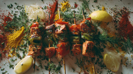 Indulge in the culinary art of grilled skewers featuring fresh fish and vegetables, enhanced with vibrant spices and herbs for a mouthwatering experience.