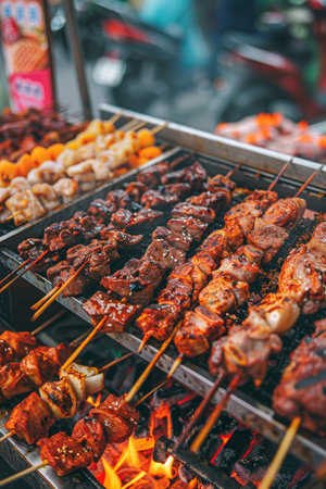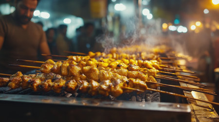 A vibrant scene of grilled skewers at a bustling night market, showcasing the art of cooking over an open flame, surrounded by delicious aromas and lively atmosphere.
