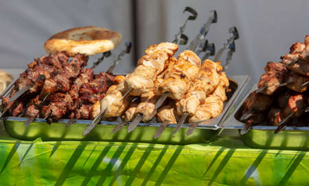 Meat skewers grilled on food market. Selective focus