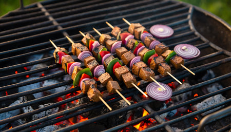 Juicy lamb kebabs and vibrant vegetable skewers with bell peppers and red onions grilling over hot coals, creating a smoky aroma. perfect for outdoor cooking, summer parties, and healthy meals.