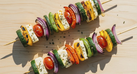 Enjoy a vibrant display of grilled skewers featuring juicy meat and fresh vegetables. Perfect for summer gatherings and outdoor cooking adventures.