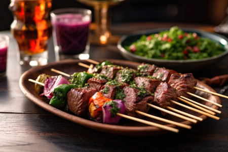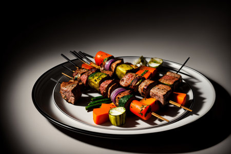 charred lamb kebabs with colorful veggies on skewers, created with generative ai
