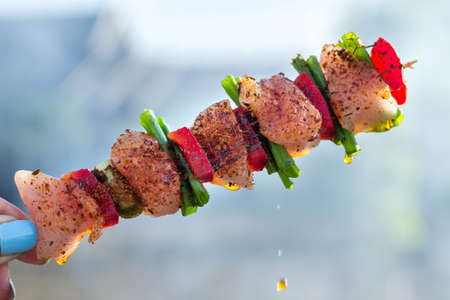 Close up pf delicious chicken breast on wooden skew with fresh vegetables, garlic, paprika fried on mangal barbeque grill