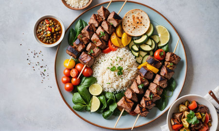 A vibrant platter featuring grilled chicken skewers, fluffy rice, and colorful vegetables garnished with lemon. Ideal for summer dining and gatherings.