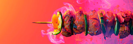 Vibrant grilled skewers featuring colorful vegetables and succulent meat over a charcoal fire, exuding delicious aromas and a summer vibe perfect for outdoor gatherings.