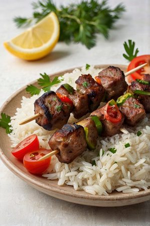 Delicious grilled meat skewers served over rice with lemon and tomatoes for a healthy and flavorful meal or recipe concept.
