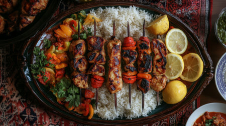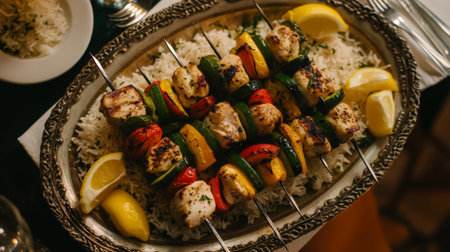 A top-down view of a colorful platter of chicken and vegetable kebabs, garnished with lemon wedges and served with a side of rice, enhancing the culinary appeal.