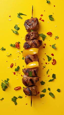 Savory grilled meat skewers adorned with vibrant yellow peppers and fresh herbs set against a lively yellow backdrop perfect for a summer barbecue.