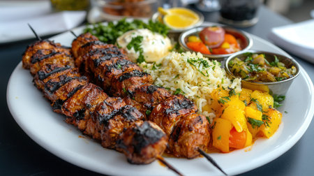 A plate of freshly grilled barbecue skewers served with vibrant side dishes