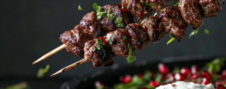 Freshly grilled lamb kofta skewers with a smoky char, flying in mid-air with a dollop of tzatziki, garnished with pomegranate seeds and chopped mint.ai generated