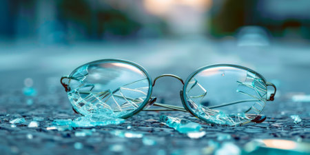 Cracked glasses lie on the ground reflecting sunlight among shattered pieces