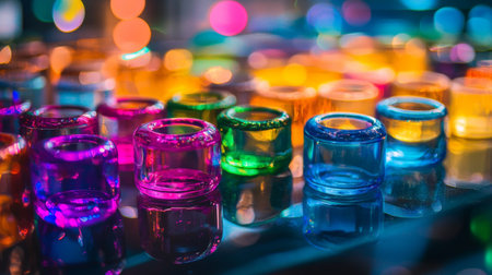 Vibrant image of colorful glass candle holders in pink, green, blue, and yellow, set against a lively background with bokeh lights, ideal for festive and decorative themes.