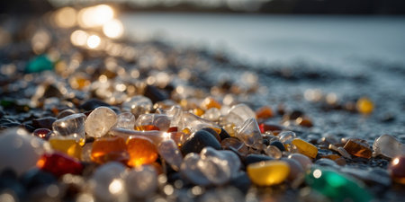 Close-up of recycled glass shards in different colors, glistening under sunlight in a recycling facility