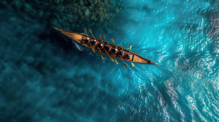 Aerial view of rowing boat with multiple oarsmen navigating through clear turquoise water, showcasing teamwork and harmony in motion. vibrant colors create serene and captivating scene