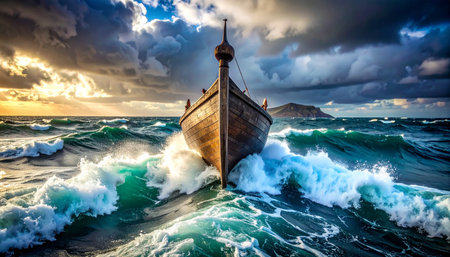 A lone Viking drakkar bravely cuts through the tumultuous waves of a raging storm.