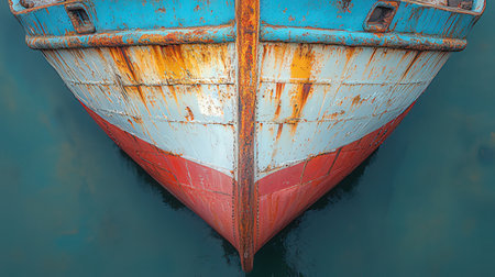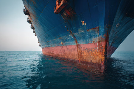 Close-up of a massive cargo ship's bow painted deep blue and red, showing rust marks and industrial textures. The vessel is anchored at sea under bright daylight with a soft haze.