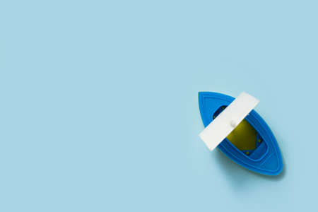 A vertical, high-key stock photo featuring a small, colorful, hand-painted wooden toy boat centered