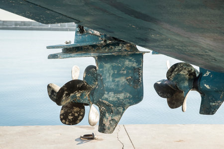 Detailed shot of a cargo ship stern with visible propellers and rudders, captured from a low angle as the ship moves through the water.