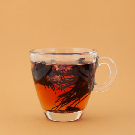 Medicinal herbal tea of Dried Rhodiola quadrifida or Red brush plant, also called as Siberian ginseng. Transparent cup, side view. Drink used to support mental and physical endurance.