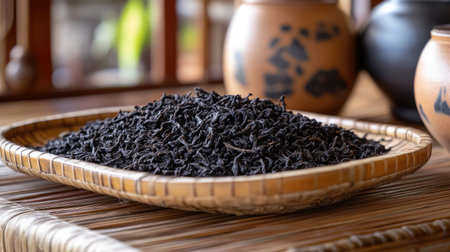Close-up of dried black tea leaves beautifully arranged on a bamboo tray, surrounded by traditional pottery, showcasing tea culture and natural elegance.