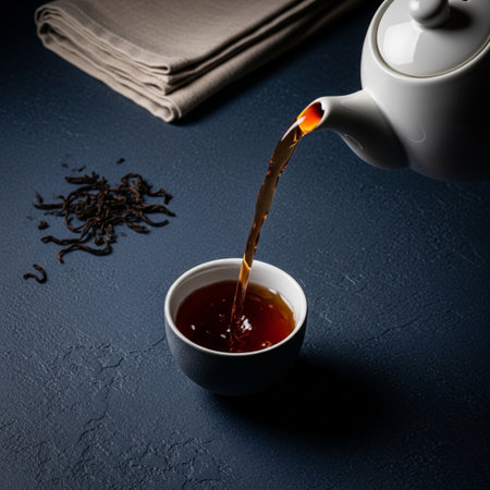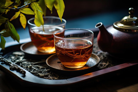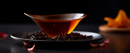 Pouring freshly brewed black tea in a glass cup and dry black tea on dark background with copy space. AI generated.